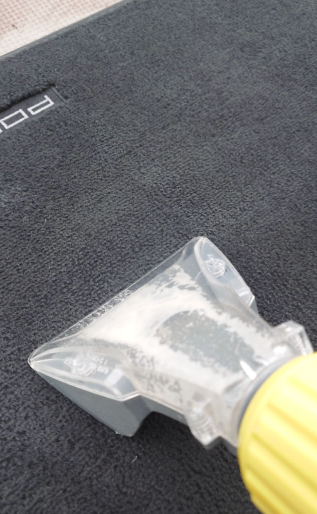泥汚れの強いフロアマット付近は専用の機材を使い、溶剤と共に汚れも水分ごと吸水して行きます。