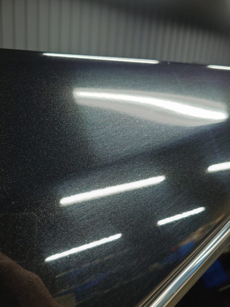 左側のフロントドアが磨き前、右側のフロントフェンダーが1工程目の磨き後です。